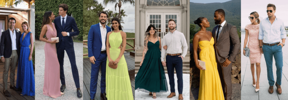 Para as mulheres: vestidos midi ou longos, em modelos de festa.